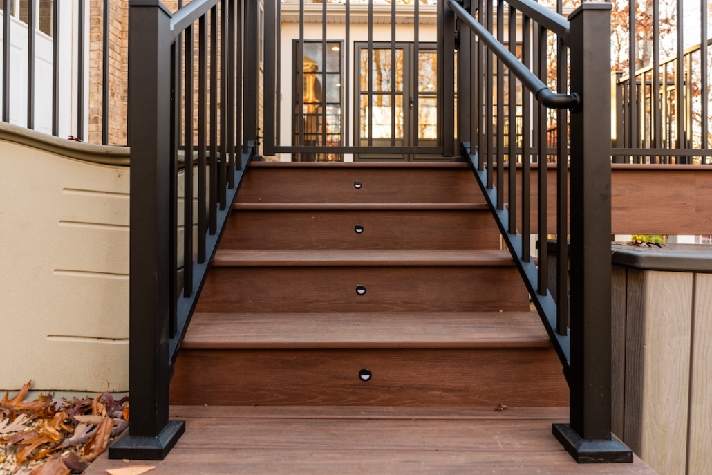 Our team finished this renovation with details for added ambiance and safety. We added wired-in lighting to the post caps and stair risers for evening gatherings. The Chatburns also added a gate to the deck to make it safer for their children and guests.